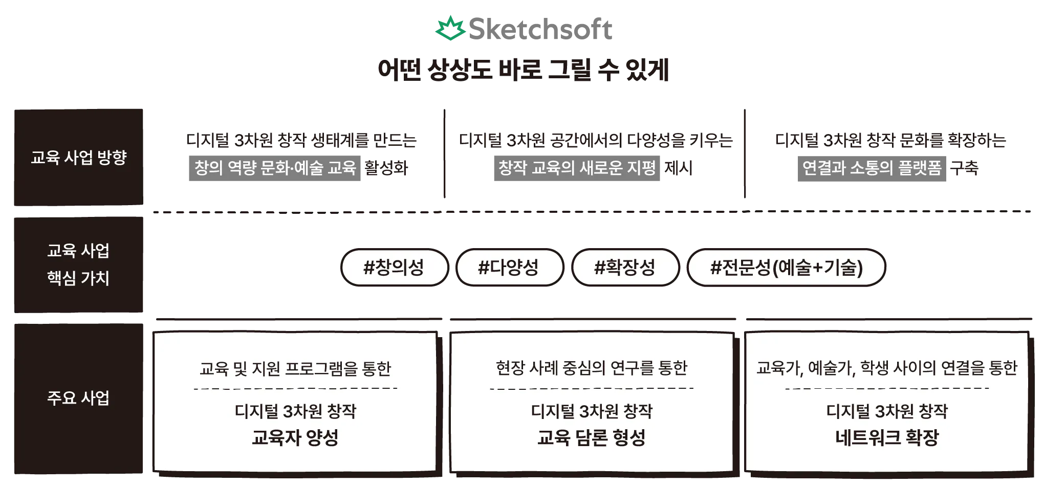 변화하는 미래, 다가오는 시대에는 주도적이고 능동적인 창작자가 필요합니다. 가상과 실재를 넘나드는 3차원 메타버스 환경을 향유하고 직접 활동할 세대에게는 디지털 3차원 창작과 그에 대한 이해가 첫 발걸음이 될 것입니다. 스케치소프트는 교육 사업을 통해 가장 가볍고 장벽이 낮은 디지털 3차원 창작 교육을 탐구하고 구현하며, 3차원 스케치북 프로그램 ‘페더’를 통해 누구나 즐겁게 상상을 현실로 표현할 수 있는 환경과 생태계를 만들어가고자 합니다.