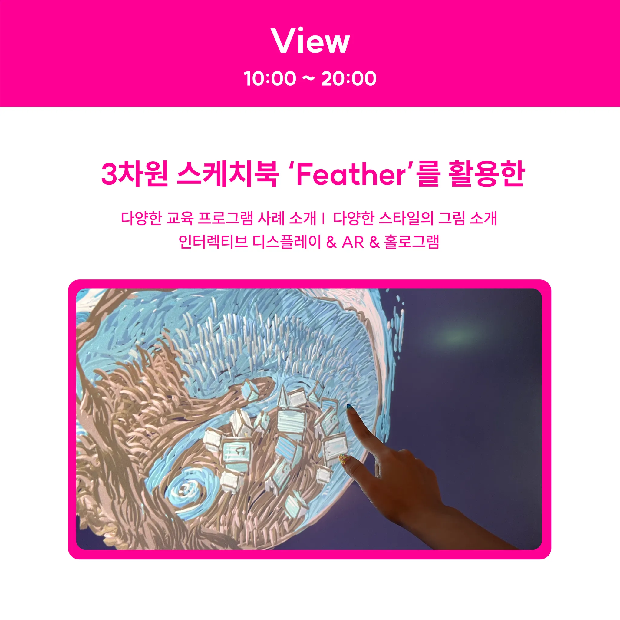 View Feather를 활용한 다양한 작품들과 진행되었던 교육 프로그램 내용을 감상할 수 있습니다.