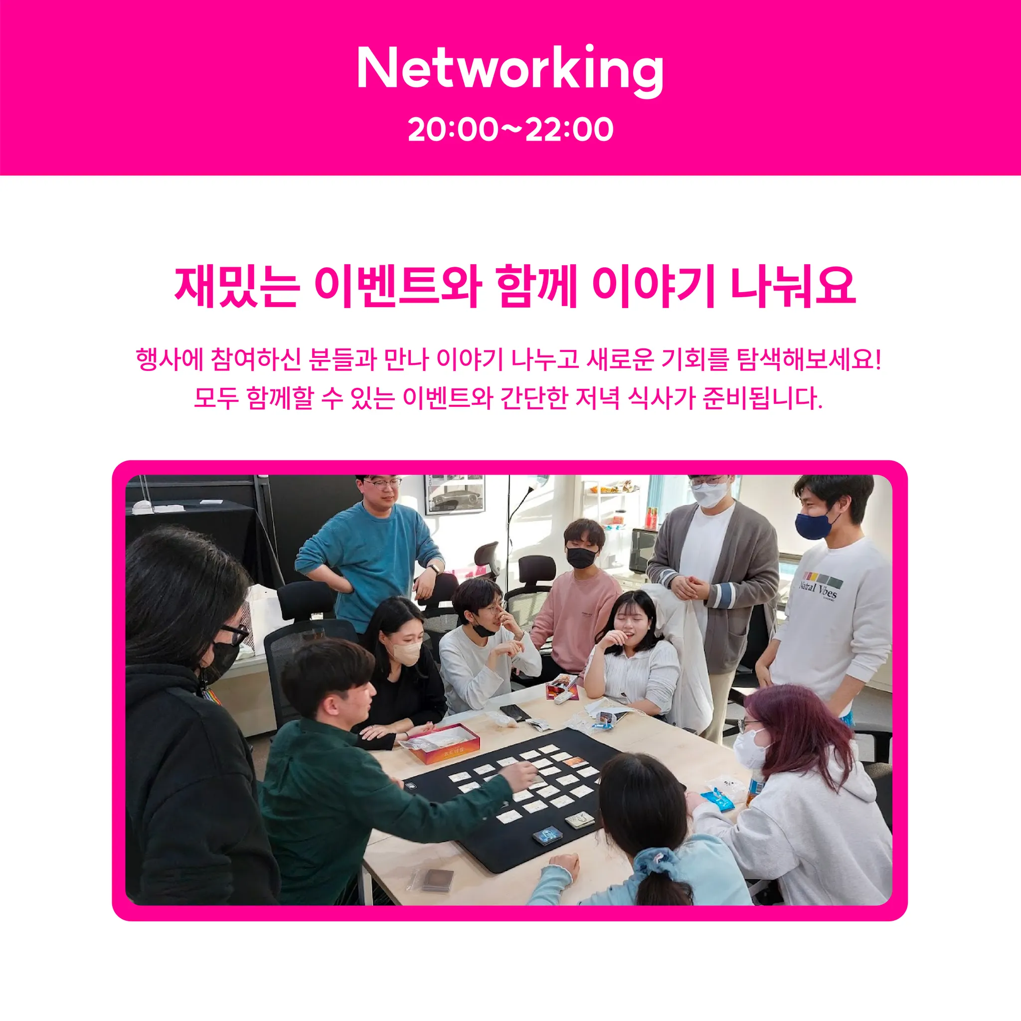 Networking: 간단한 저녁 식사와 함께 재밌는 이벤트가 진행됩니다. 이벤트에 참여하면서 다른 참가자 분들과 만나 이야기도 나누고, 새로운 기회를 탐색해보는 시간을 가져봅니다.