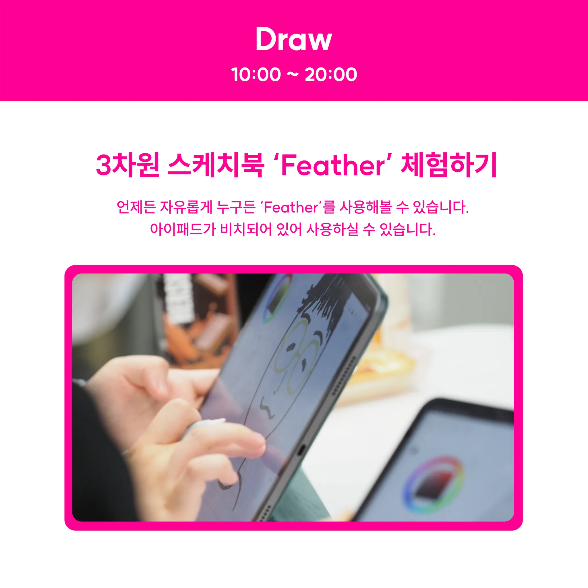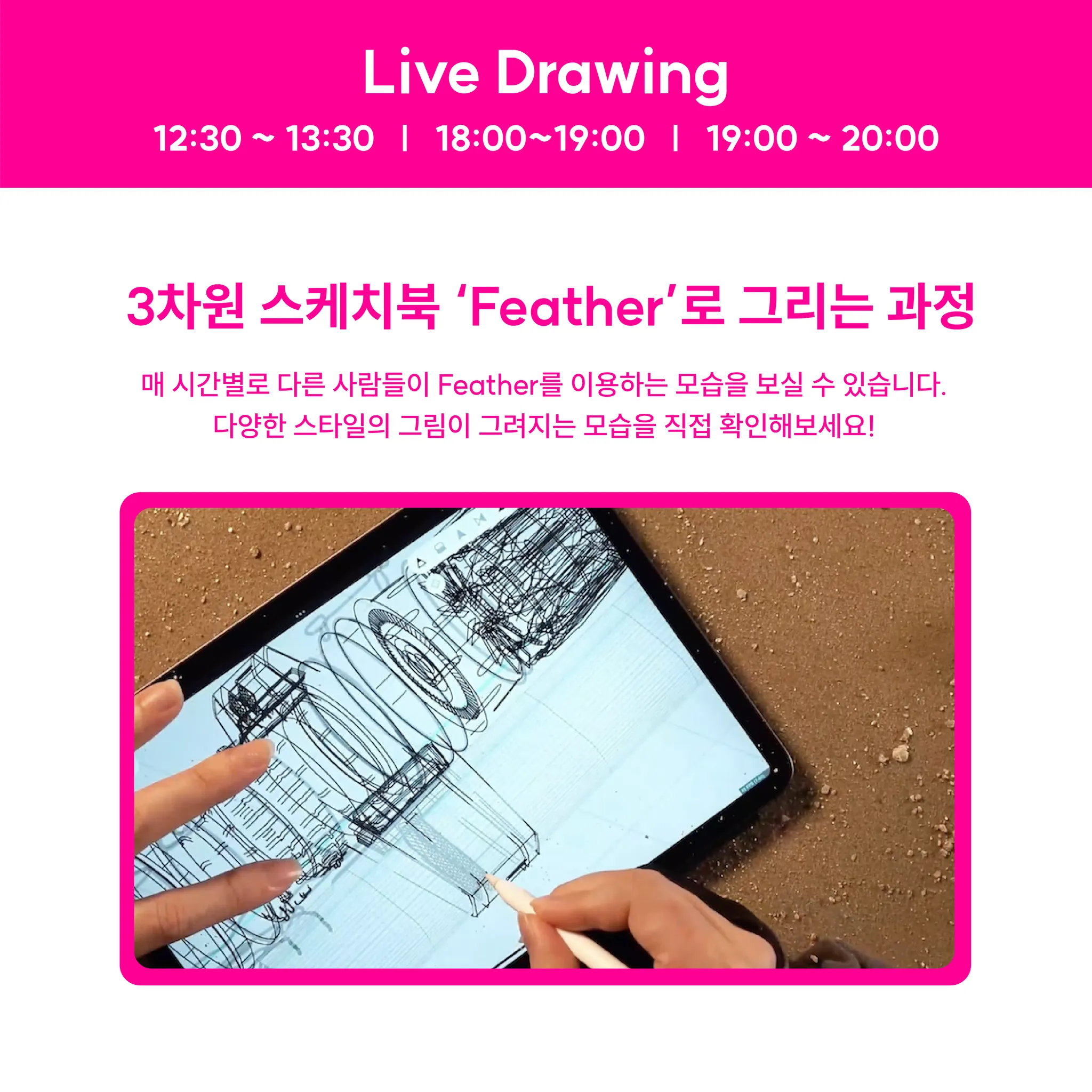 Live Drawing: 서로 다른 스타일을 가진 Feather를 이용하는 창작자들의 그림을 그리는 과정을 현장에서 볼 수 있습니다.