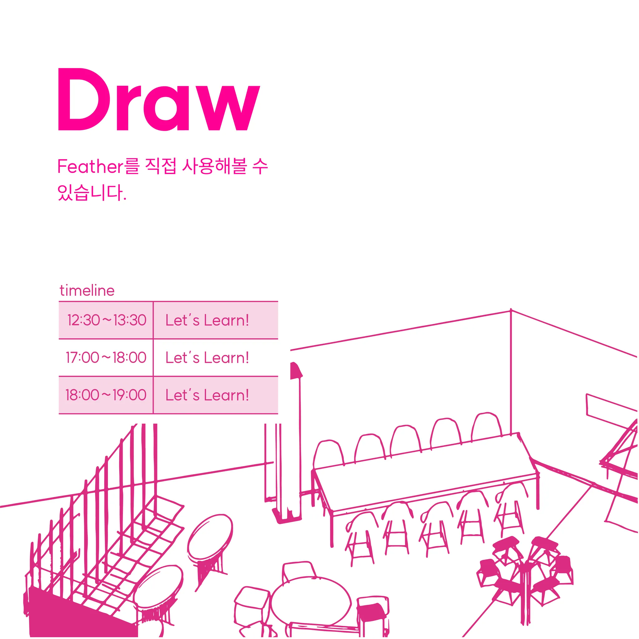 이번 행사를 통해 Feather를 활용한 다양한 교육 프로그램 사례들과 예시작, 그리고 확장하여 활용할 수 있는 가능성을 다양한 방식으로 보여드리고, 함께 예술 교육에 대해 이야기 나눌 수 있는 자리를 마련하고자 했습니다.